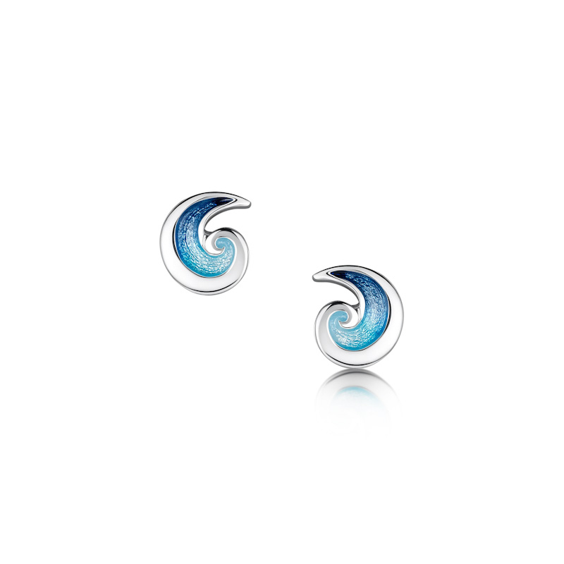 These small Breckon Stud Earrings in sterling silver feature a single wave design, hand-enamelled in our Orkney workshop in Pentland enamel. Each earring measures approximately 10mm wide.